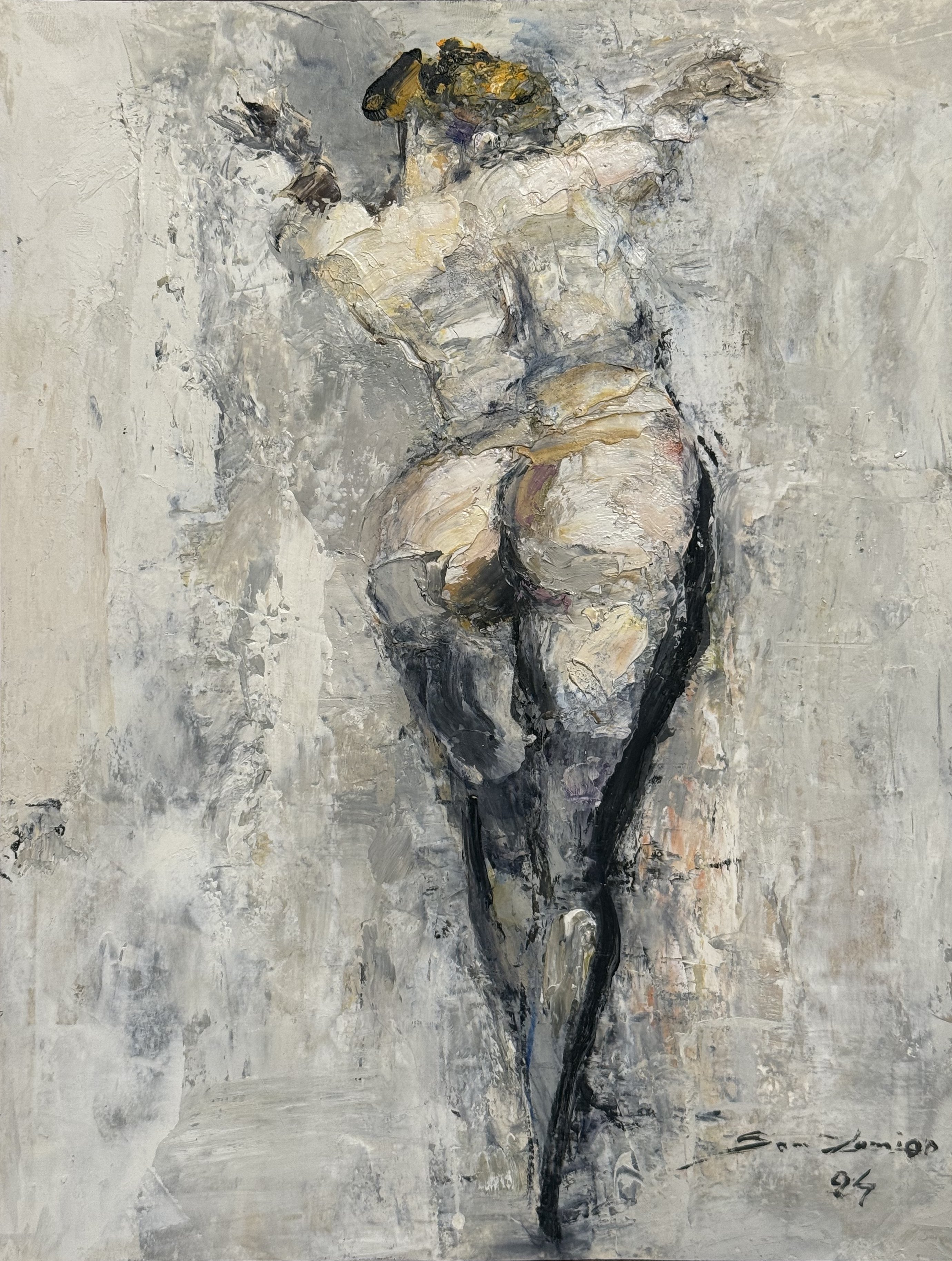 The world to me is a big theater where my characters have roles to enjoy with their dramatic, mysterious, joyful or even grotesque images. Some of them display the promise of love; others awake various emotions with outlined demonstrations of their bodies. Some characters serenely swing on ropes or dance to fast rhythms. Other characters, with the tension of tight string, grasp onto unstable ladders trying to maintain their balance and passionate crowds flee to indistinct directions.