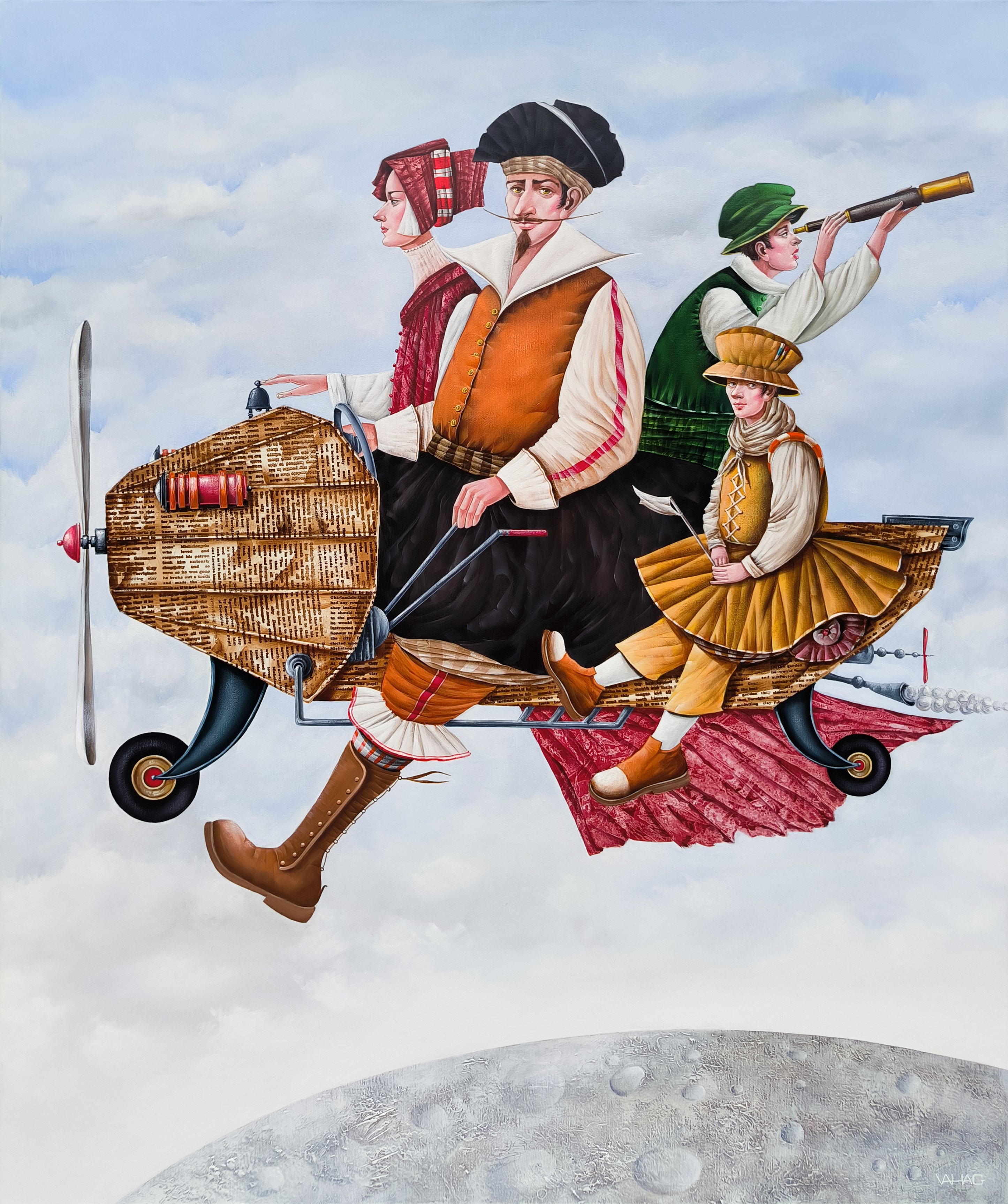 Vahagn Harutyunyan's works are reminiscent of surreal aesthetic moments, as if at some point your gaze found a beautiful combination of images in the everyday environment, stuck at that moment, trying not to miss any detail from the general scene. However, you are not the only observer, just the opposite, the characters in Vahagn's paintings look at you carefully with their penetrating gaze, as if you are a character representing your reality to them. Every detail in Vahagn's works is thought out and emphasizes the aesthetics of the overall picture. The costumes of the characters, the posture, the look, the layout of the general composition present a dynamic scene to the observer. It seems that at some point the characters in Vahagn's works will start telling about themselves, and the background, the composition and the appearance of the characters in the pictures will help you to move completely to the reality of the story, to wait carefully for the continuation of the story.